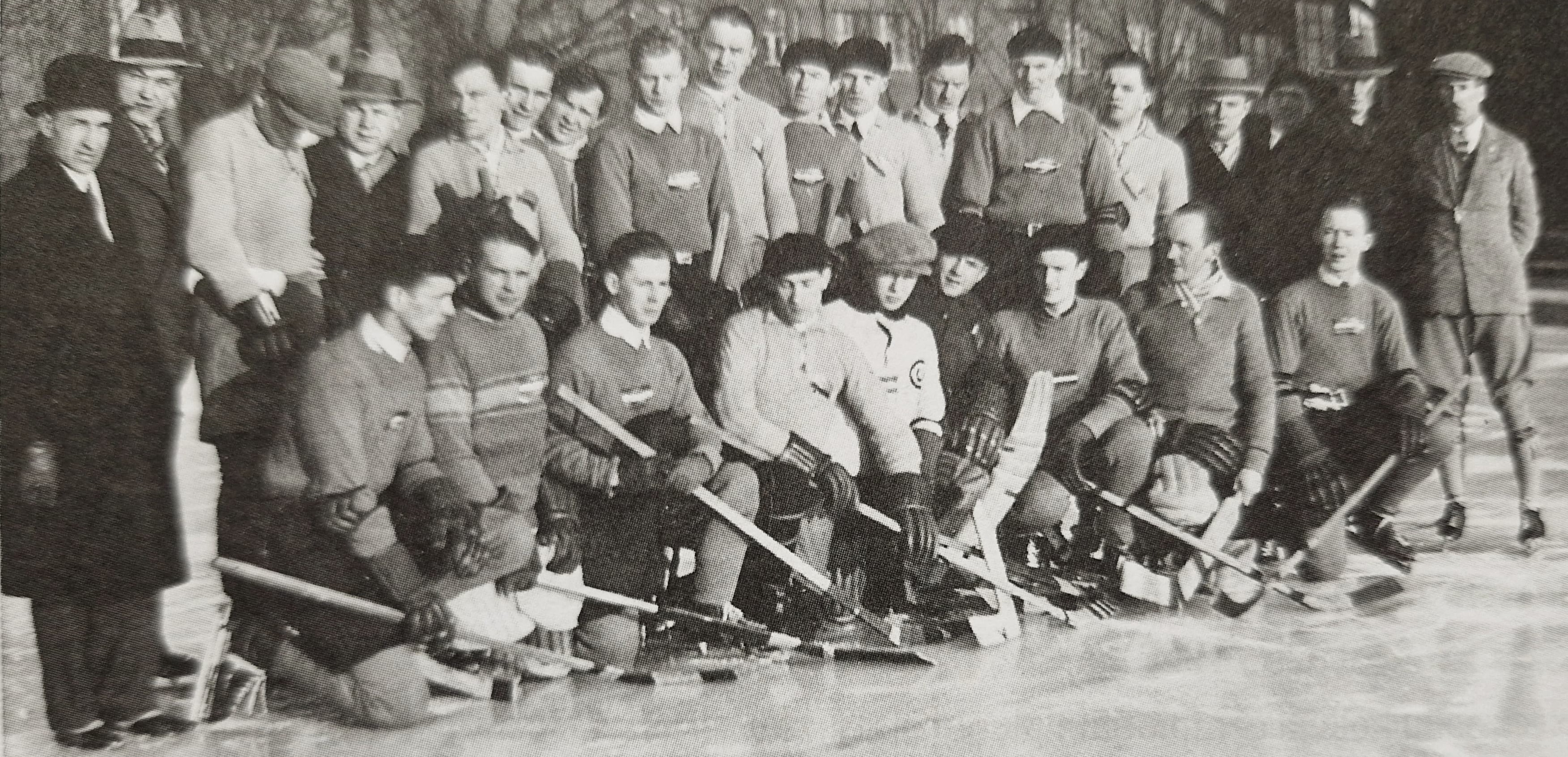 Attēlā: SSS hokejisti, kuri spēlēja pret Vācijas strādnieku izlasi, Rīgas Centra nodaļas slidotavā J. Asara ielā, 1930 gada 16. februārī. Fonā Svētā Pāvila baznīca un Sarkanā Krusta slimnīca.