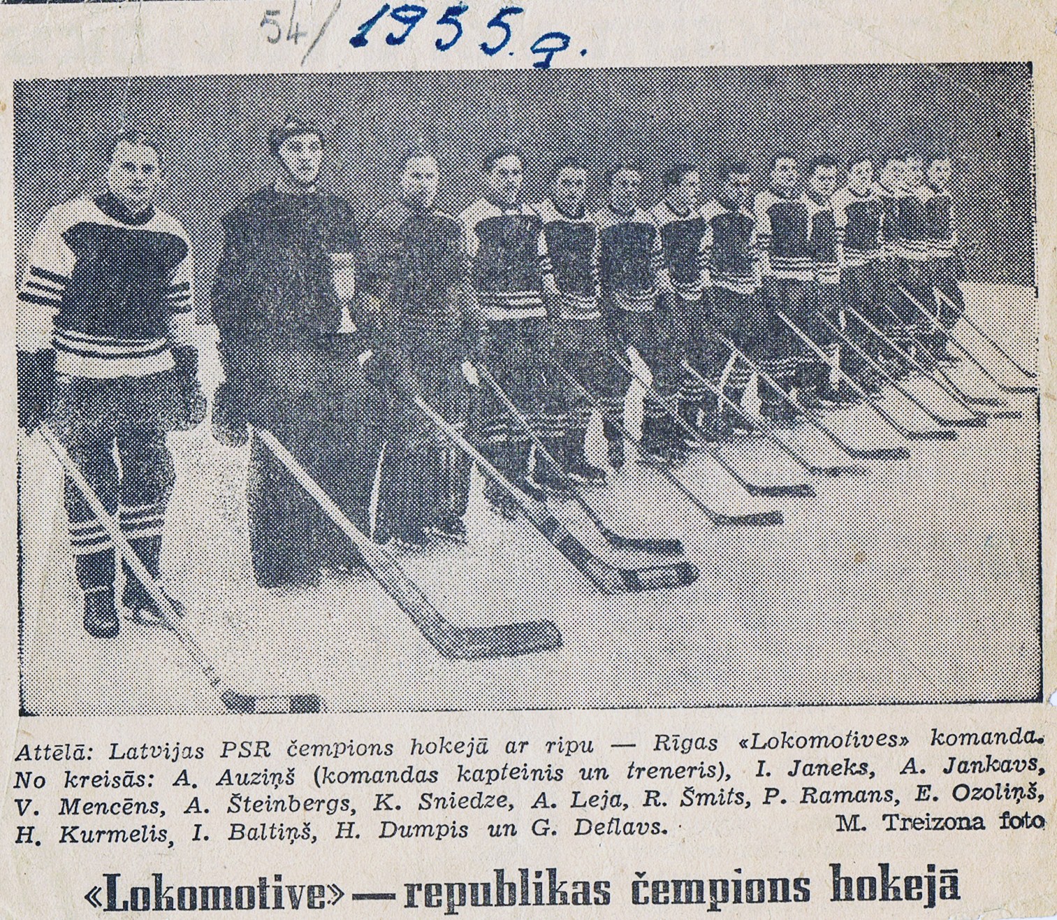 1955. gada Latvijas PSR čempionāta finālturnīrā 6 komandas (3 no Rīgas un pa 1 no Cēsīm, Talsiem un Liepājas) izspēlēja vienu apli, un par čempioniem kļuva Rīgas LOKOMOTĪVE. Attēlā: 1955. gada LPSR čempioni Rīgas LOKOMOTĪVE - no kreisās: spēlējošais treneris A. Auziņš, I. Janeks, A. Jankavs, V. Mencēns, A. Šteinbergs, K. Sniedze, A. Leja, R. Šmits, P. Ramans, E. Ozoliņš, H. Kurmelis, I. Baltiņš, H. Dumpis, G. Detlavs (foto: M. Treizons).