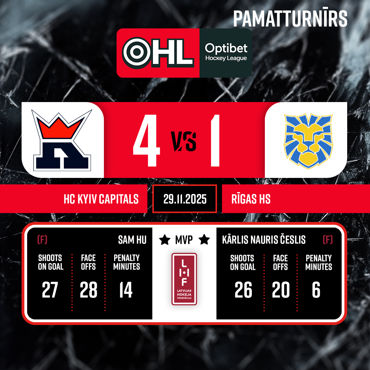 Labākie spēlētāji: Rīgas HS – ČESLIS Kārlis Nauris #16 HC Kyiv Capitals – HU Sam #67